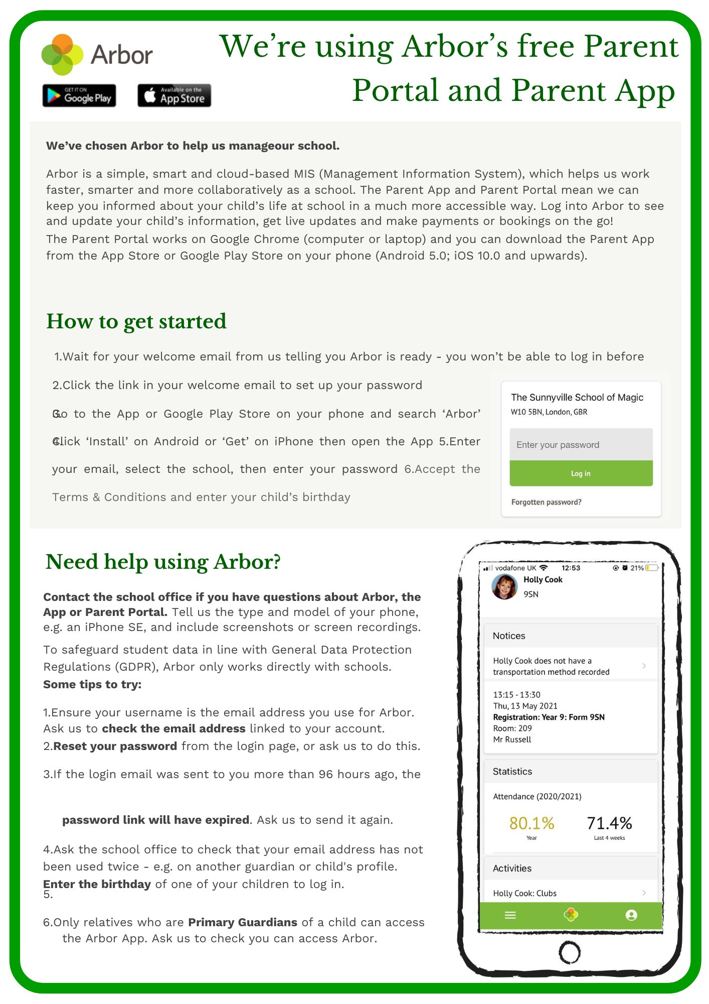 To access this app, you will need to download Arbor app on your phone via your phone's app store. It will ask you set up a password, once you put your child’s details in. It will automatically match up with our school.