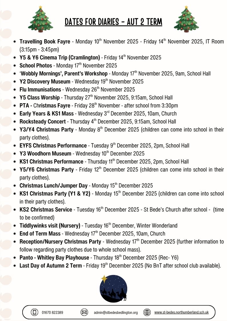 Key dates will be communicated with parents via emails from the School Office and teachers will communicate using Seesaw. Each term every child will receive a copy of the St Bede's Bugle highlighting key learning, experiences and achievements from the previous term.